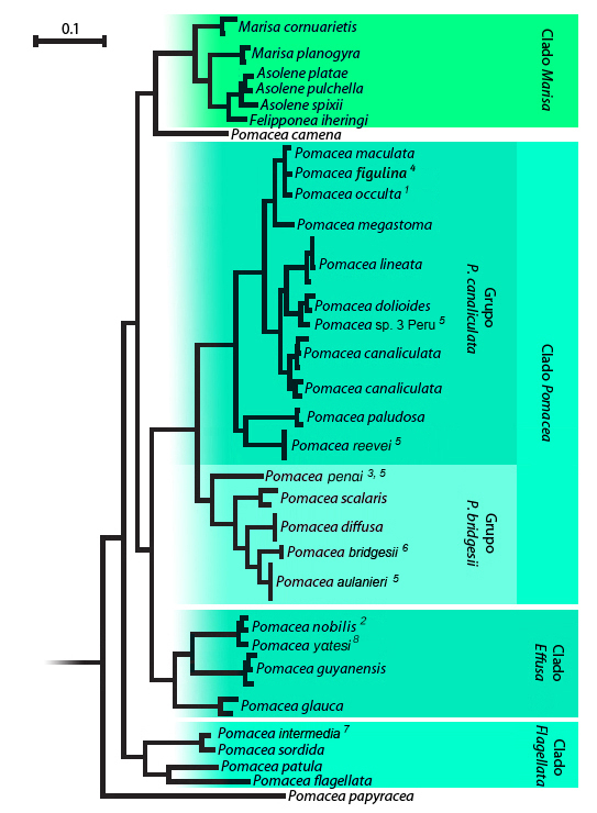 • Ampularídeos formam um clado monofilético, incluindo-se espécies africanas (não demonstrado neste diagrama). O conjunto das espécies americanas e africanas também têm uma ancestralidade comum, formando dois clados irmãos reciprocamente monofiléticos.
