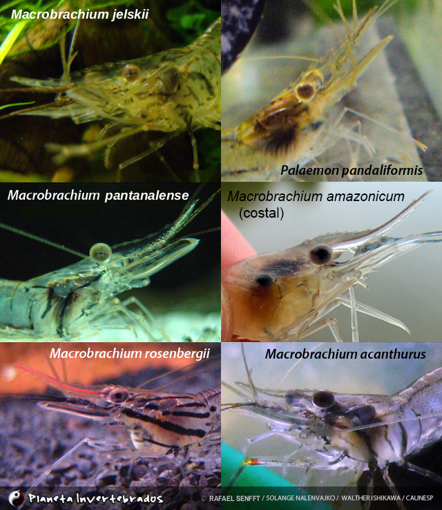 Palaemonídeos encontrados no Brasil com o rostro longo. os três primeiros são "fantasmas", e os três últimos "pitus". O Macrobrachium acanthurus não tem o rostro tão longo, mas em alguns espécimes pode haver confusão, como este da foto. Fotos de Rafael Senfft, Solange Nalenvajko e Walther Ishikawa.