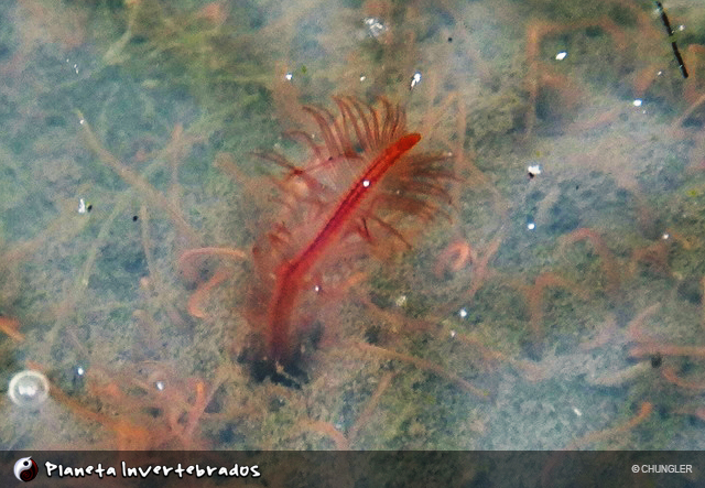 corpo segmentado são visíveis. Este gênero possui a extremidade caudal abaulada e nodular, com pequenas projeções correspondendo às brânquias, que podem se abrir como um leque. Foto de Walther Ishikawa.