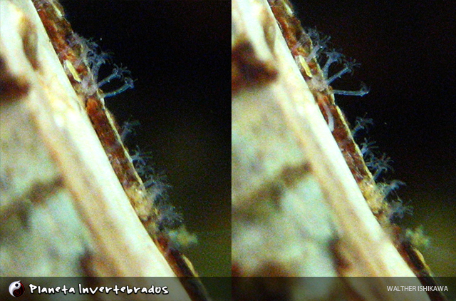 Dero (Aulophorus) furcatus, surgiram num galho submerso em um aquário de invertebrados. Fotos de Walther Ishikawa.