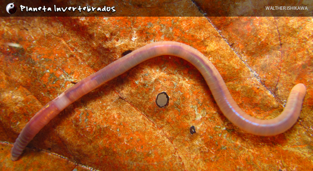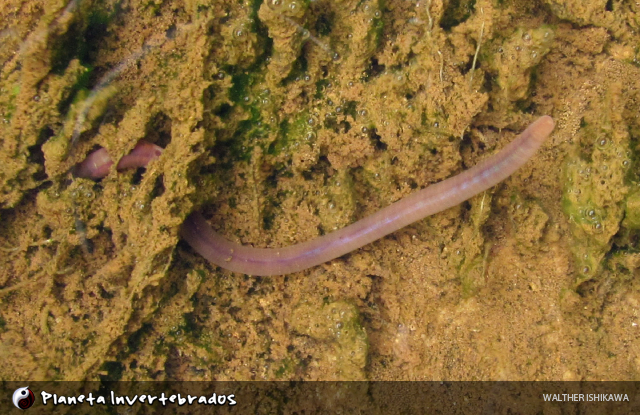 Grandes oligoquetas medindo cerca de 10 cm, encontrado debaixo de uma pedra submersa em um riacho próximo à Cachoeira do Pé Vermelho, em Águas da Prata, SP. Talvez um Eukerria. Fotos de Walther Ishikawa.