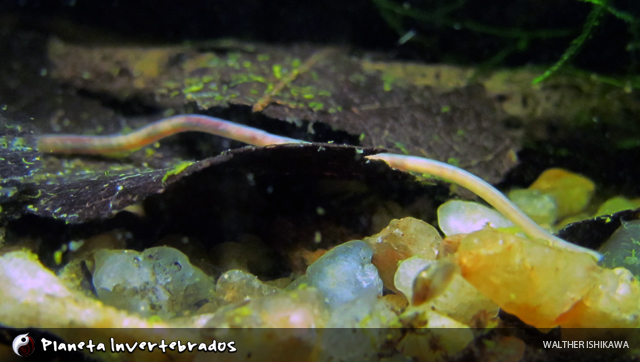 Grandes oligoquetas (o maior media 5,7 cm) encontrados dentro de um filtro interno de aquário. Muitas vezes estes vermes são confundidos com minhocas terrestres. Fotos de Walther Ishikawa.