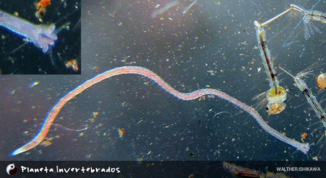 Oligoqueta Pristina sp., uma das espécies mais comuns, mas de diminutas dimensões. Este exemplar media cerca de 1,5~2,0 mm. Note a grande probóscide. Fotos gentilmente cedidas por Natalia Cristina Venancio.