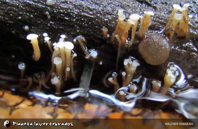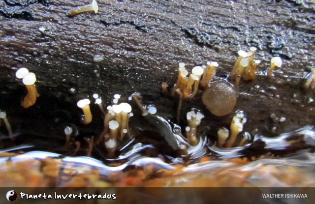 que surgiram num tronco submerso num aquário de camarões anões, em Francisco Beltrão, PR. Na última imagem, na porção emersa de um tronco. Fotos gentilmente cedidas por Claudemir M. Moreira.